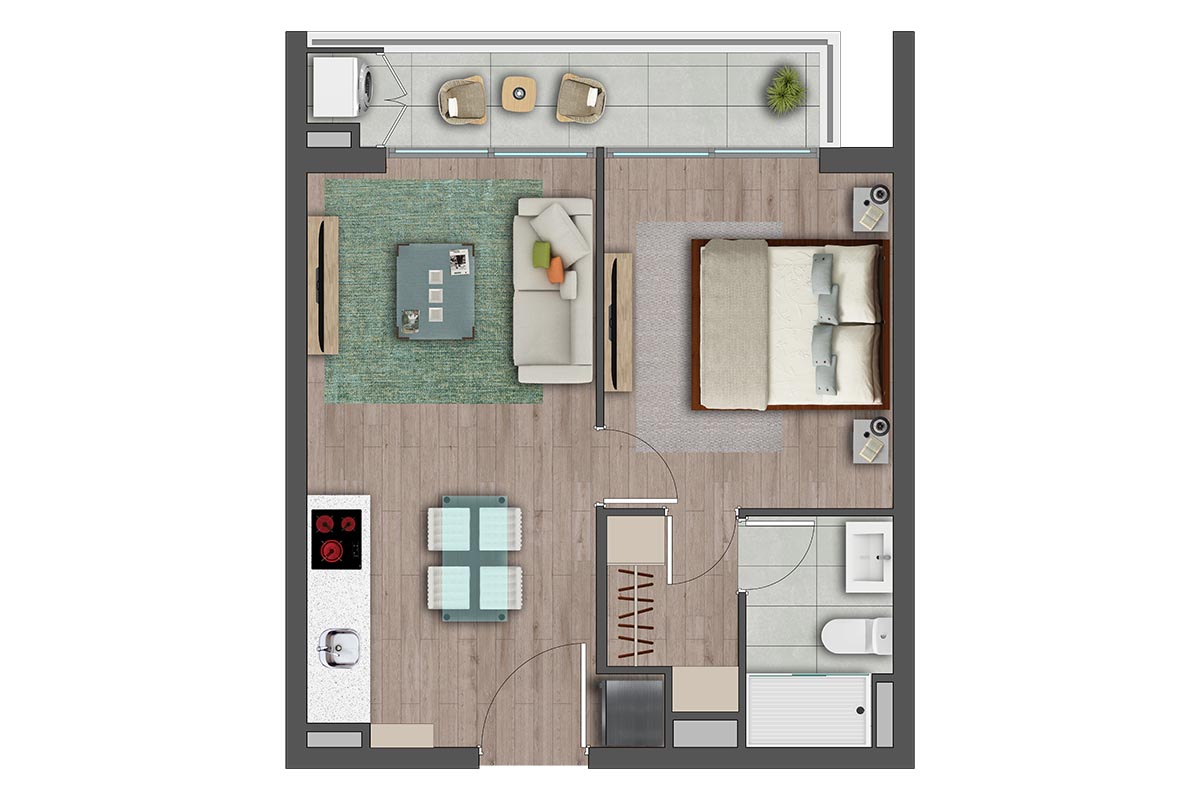 Adicionalmente, una propuesta arquitectónica con la más alta calidad de diseño y en baja altura, para generar espacios para una vida tranquila y acorde a las expectativas de las personas. Un edificio de solo 12 pisos, departamentos de 1 y 2 dormitorios y 12 locales comerciales.