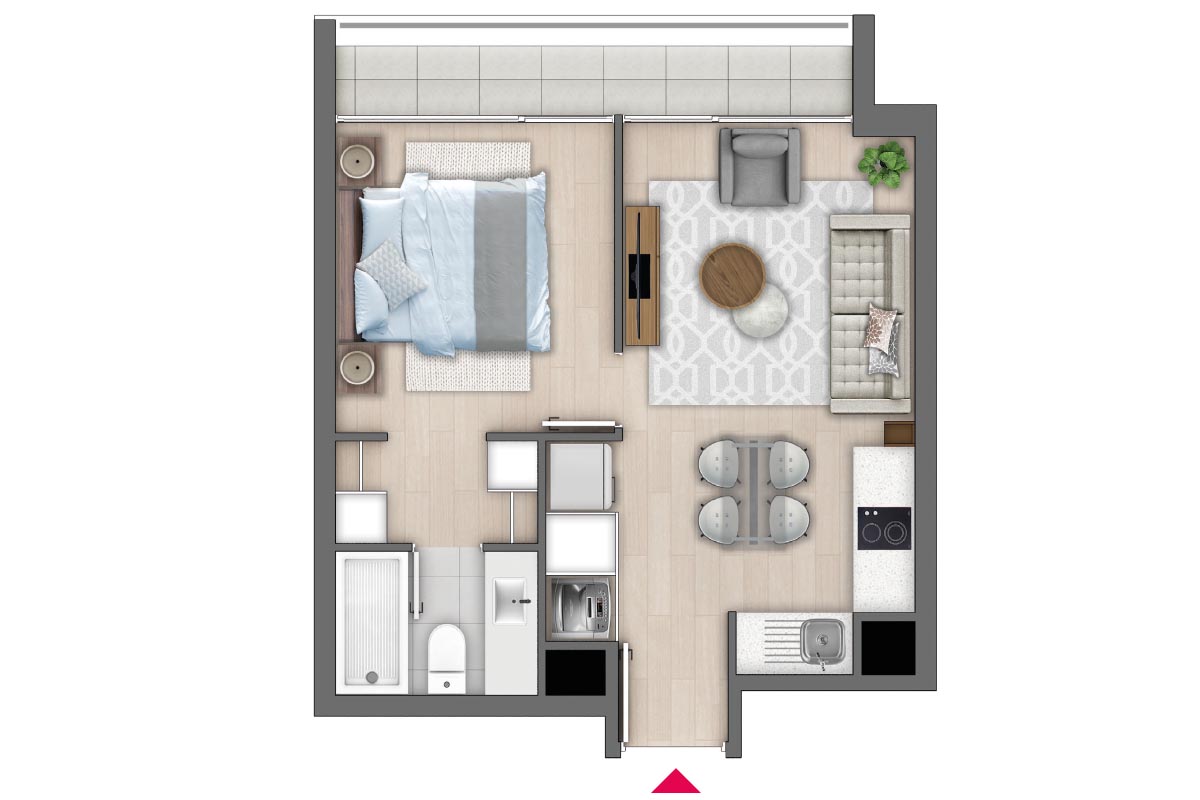 Exclusivos deptos tipo loft, deptos de 1 y 2 dorm. Con cocina integrada o tradicional, cocina equipada con horno y microondas empotrado, encimera, campana de acero inoxidable y cubierta de cuarzo en cocina, puertas de acceso enchapadas, ventas de termopanel con marco de PVC, enchufes USB en dormitorio principal.